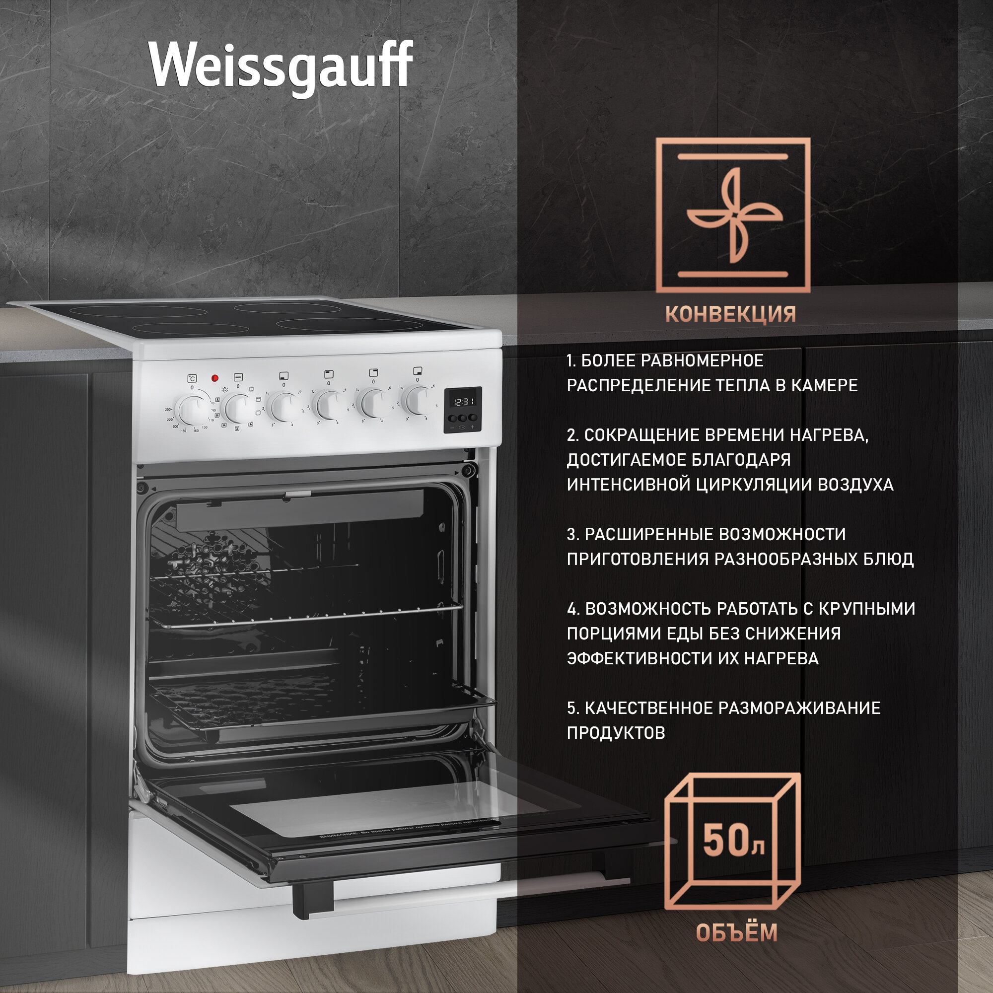 Электрическая плита Weissgauff WES E2V16 WE 3 года гарантии, Объем 50 литров, Технологичные поворотные переключатели Soft Switch, Термостат духового шкафа информация: