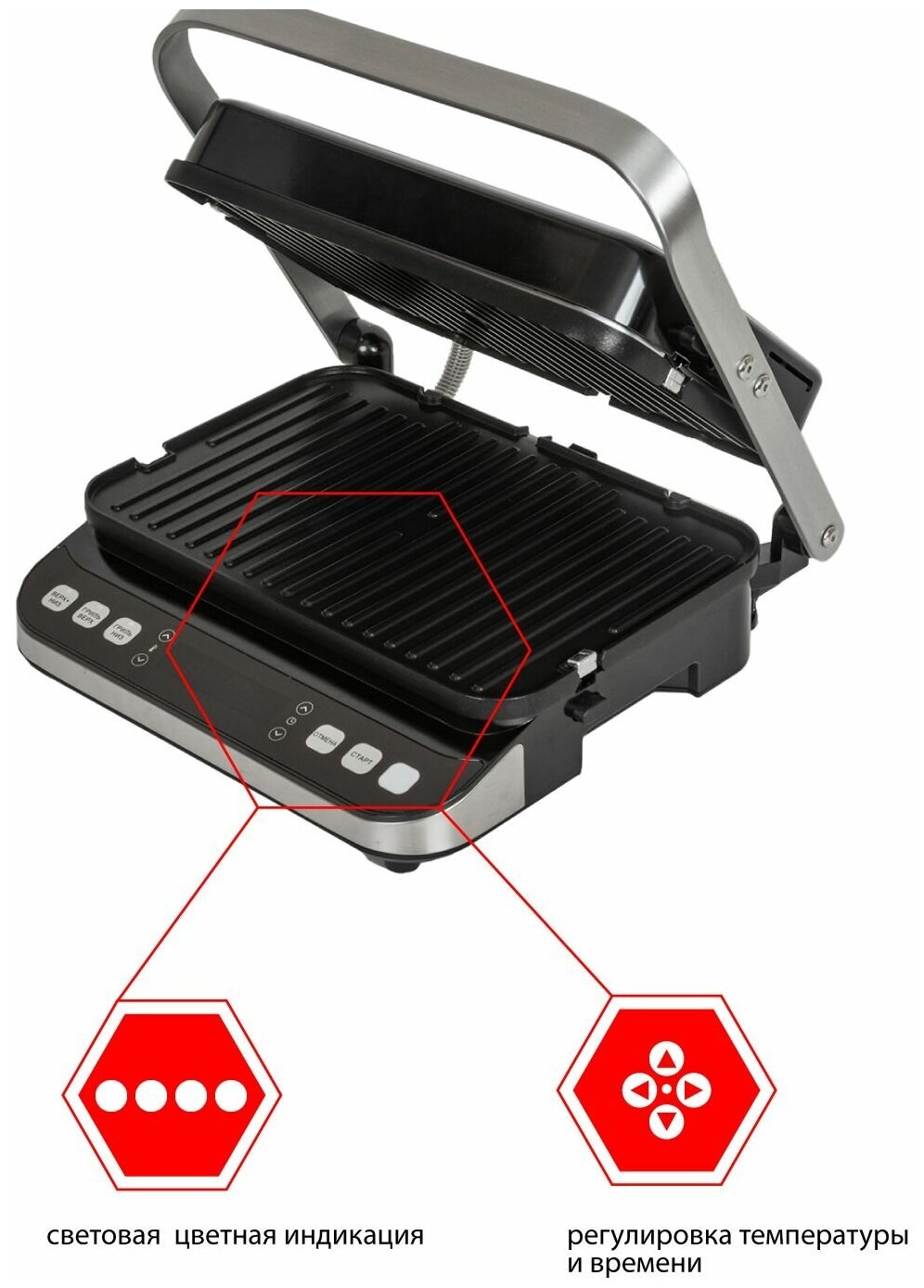 | Особенности | антипригарное покрытие / регулировка высоты верхней панели / поддон для сбора жира / съемные пластины |