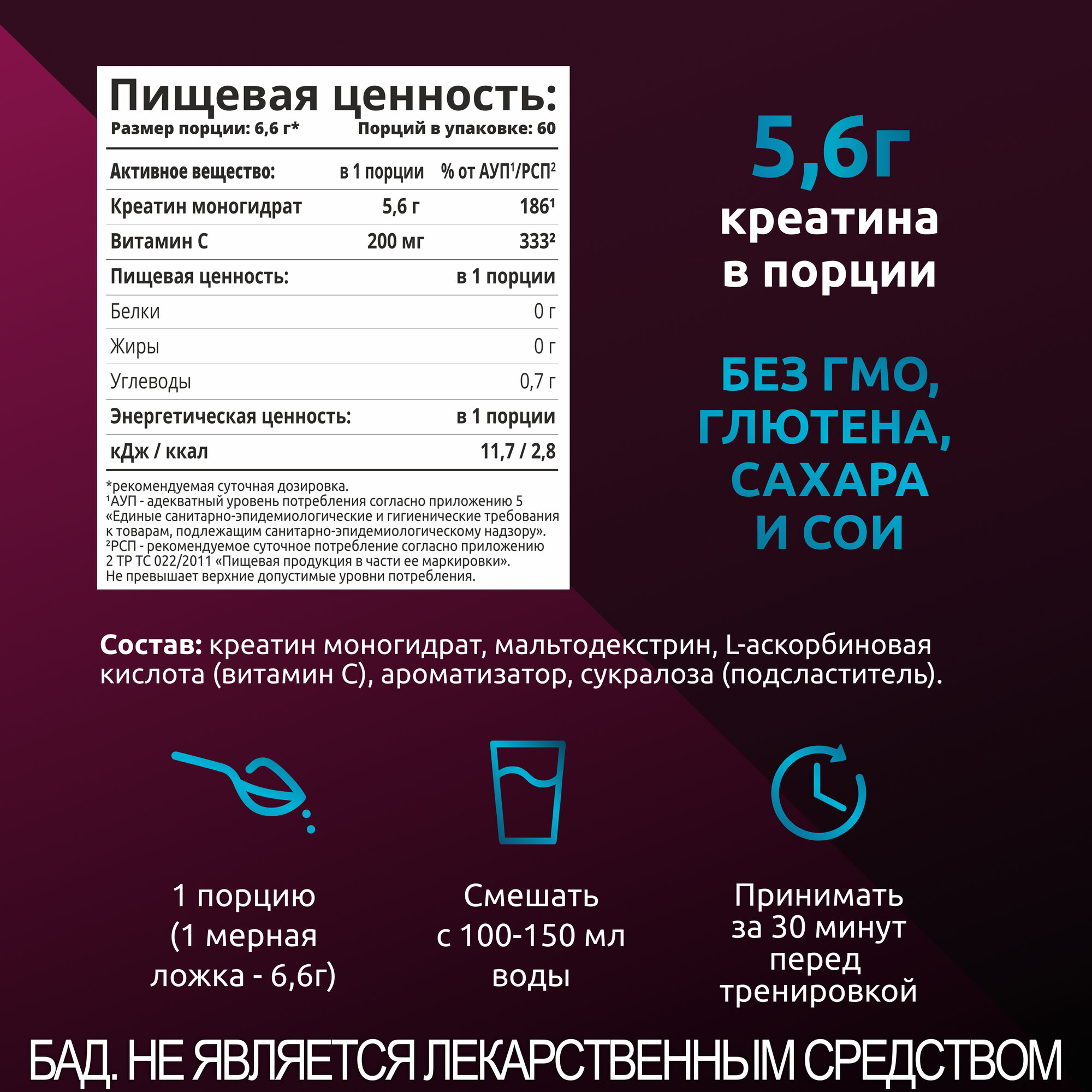 Креатин Моногидрат порошок 60 порций, 400 гр, Вкус Лесные Ягоды информация: