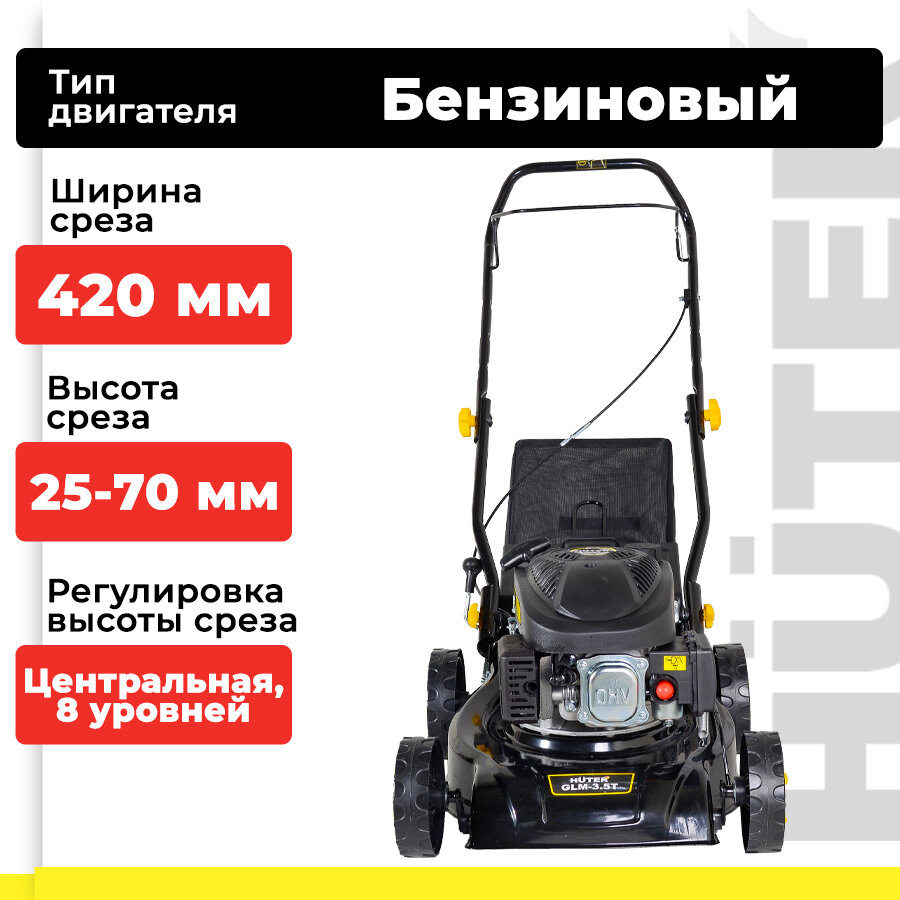 Газонокосилка бензиновая HUTER GLM-3.5T (4 л.с., 2800-3200 об/мин, 45 л, от 25 мм до 70 мм, ширина - 420 мм) информация: