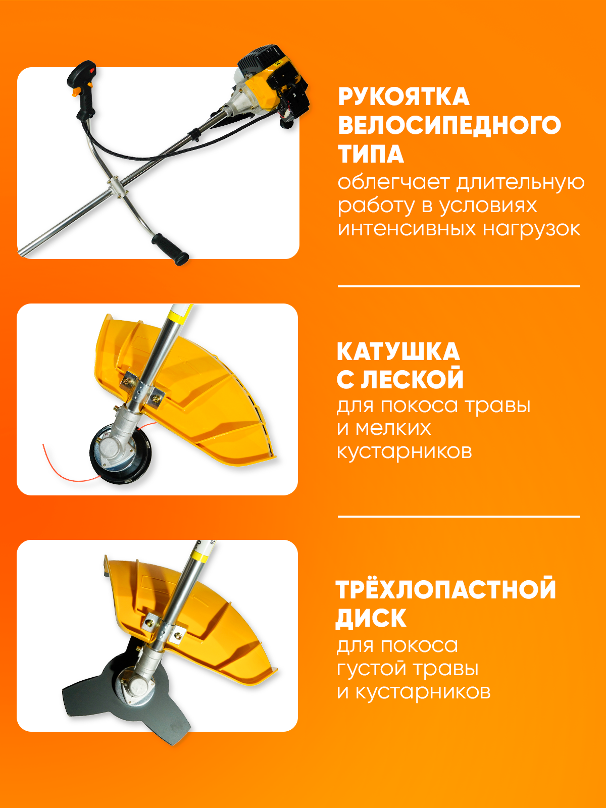 | Подробная комплектация | Бензотриммер - 1 шт. Катушка с леской - 1 шт. Режущий нож трехлопастной - 1шт. Контейнер для приготовления топливной смеси - 1 шт. Комплект инструментов. Комплект крепежа. Руководство - 1 шт. Плечевой ремень - 1 шт. Упаковка. |