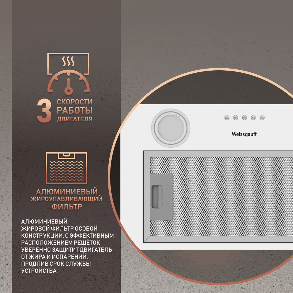 Встраиваемая вытяжка Weissgauff BOX 452 White, цвет корпуса белый, цвет окантовки/панели белый 3 года гарантии, Алюминиевый жировой фильтр, Низкий уровень шума информация:
