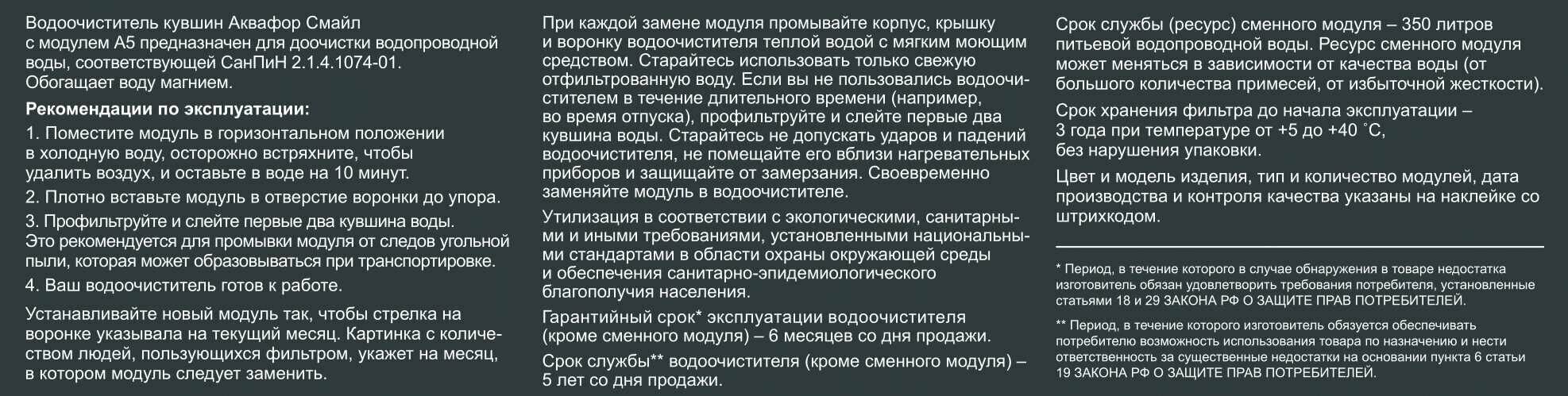 | Дополнительная информация | комплектация: сменный фильтрующий модуль A7, кувшин, воронка, крышка флип-флоп с механическим счетчиком; материал кувшина – сополиэфир Eastman TritanTM |