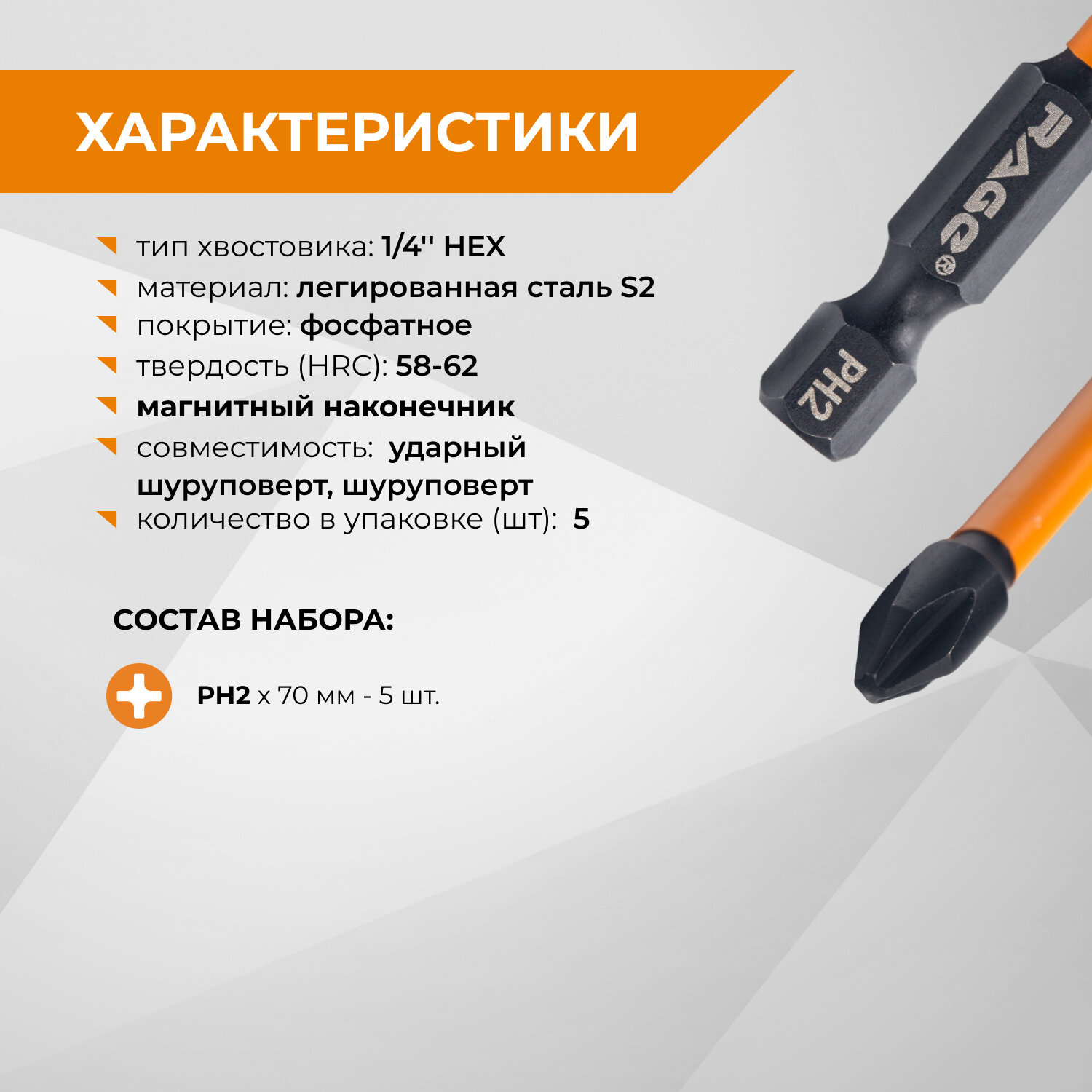 Биты торсионные S2 PH2 x 70 мм 5 шт для шуруповерта намагниченные RAGE by VIRA информация: