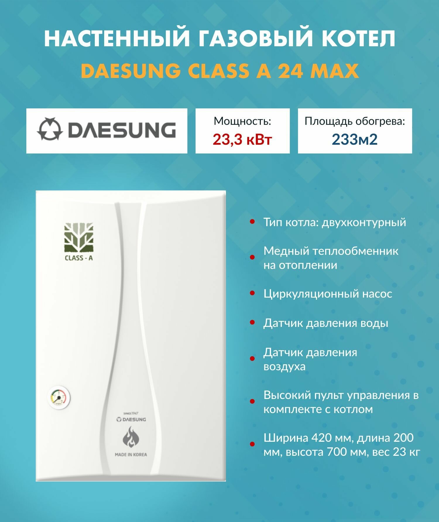 Котел газовый (24 кВт.) Daesung CLASS A 24 Max (Дайсунг) настенный конвекционный двухконтурный 10620006 информация: