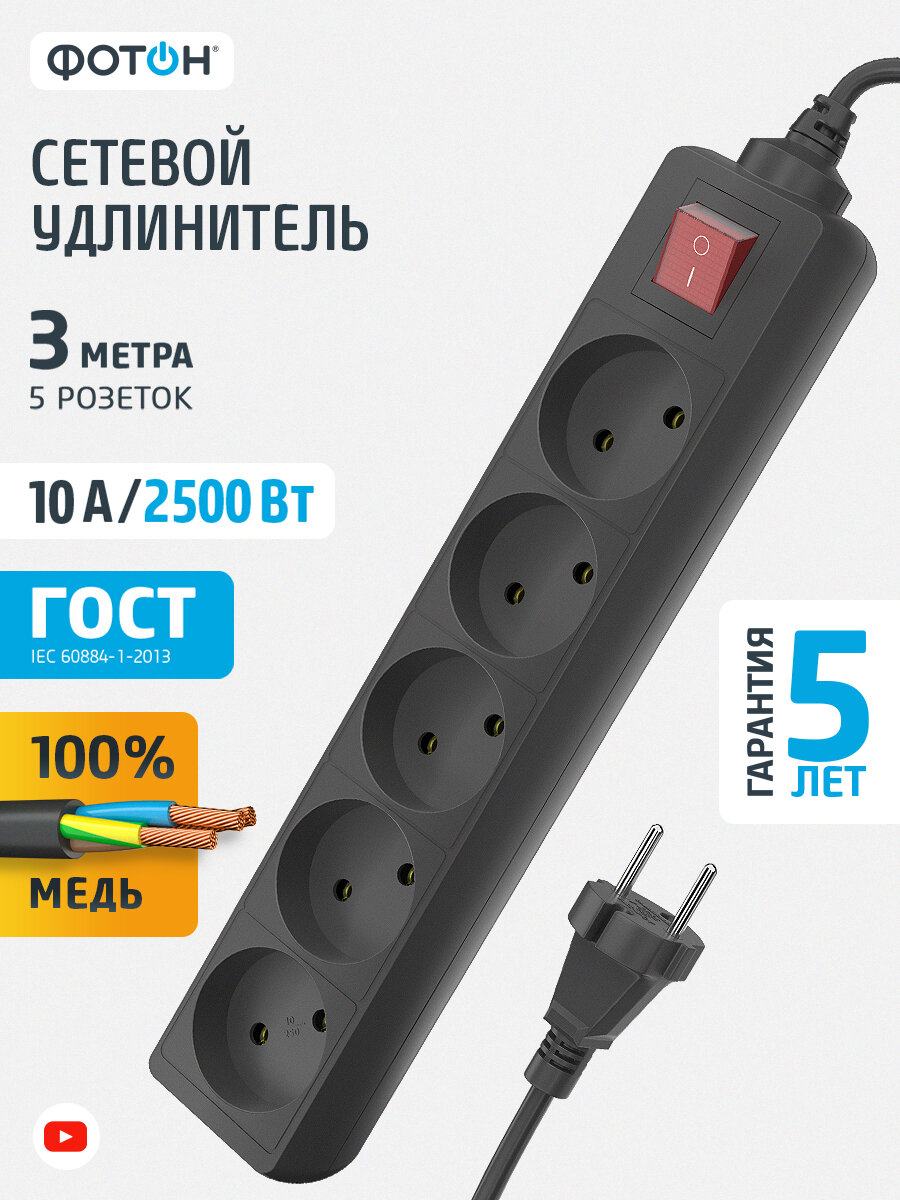 Отзывы на Удлинитель сетевой для розетки ФОТОН 10А, 3м, 5 розеток, черный, с выключателем без заземления