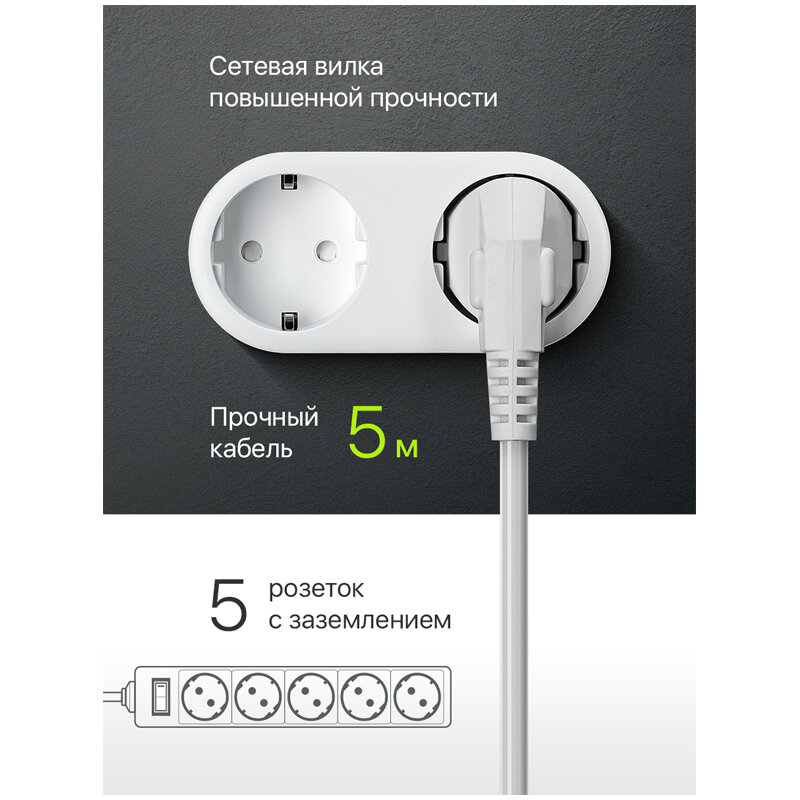 Сетевой фильтр DEFENDER ES, 5 розеток, 5 м, белый, 99483