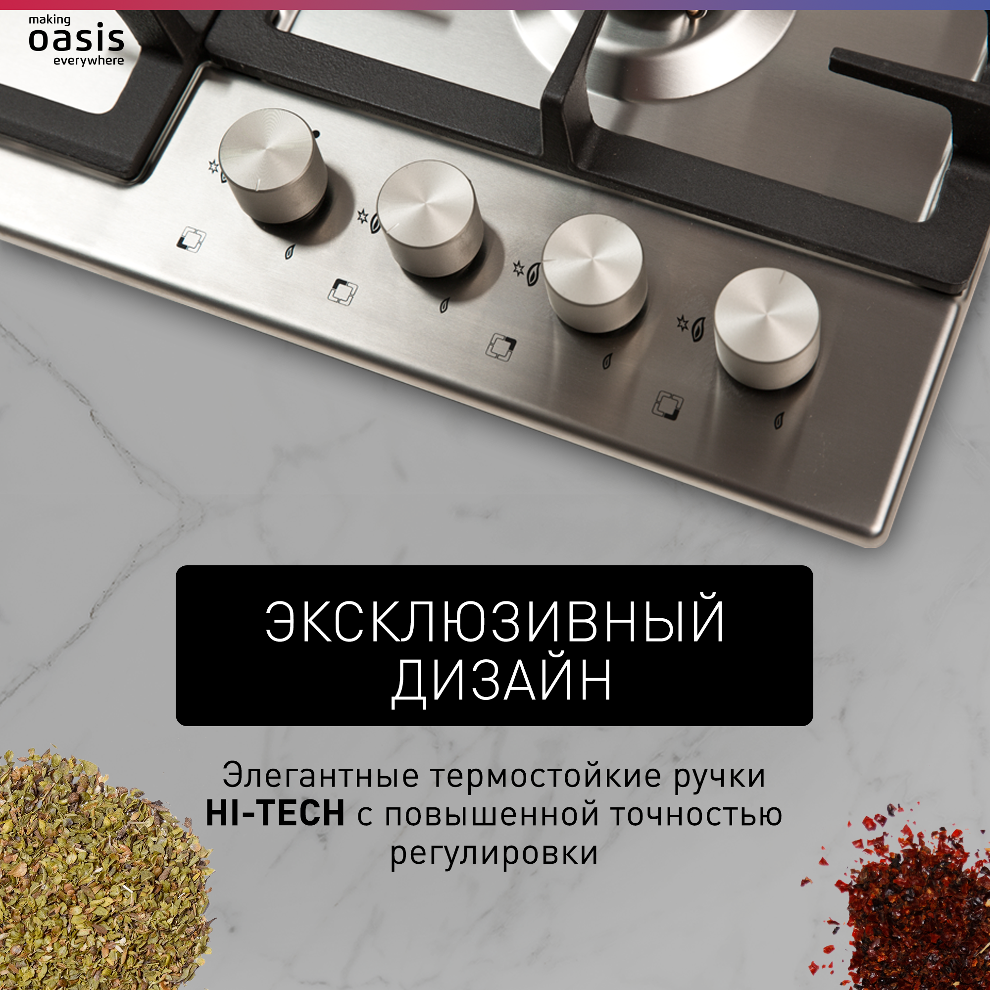 Варочная панель встраиваемая Oasis P-MNRT, 4 газовые конфорки, нерж. сталь, газ-контроль, чугунные решётки 18 350 ₽