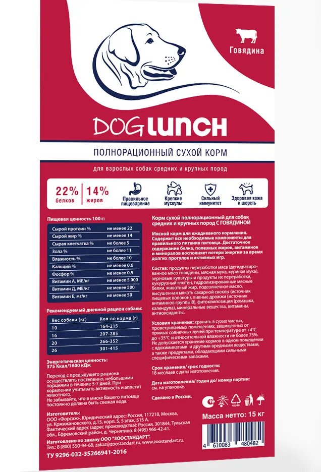 | Дополнительная информация | Органолептические свойства: Светло-коричневая гранулы диаметром 12 мм. Переход с предыдущего рациона следует осуществлять постепенно, небольшими порциями в течение 5-7 дней. Если вы уже используете любой из сухих кормов Dog Lunch, то можно безопасно чередовать вкусы в рамках возрастной линейки без переходного периода. При кормлении необходимо учитывать активность, возраст размер и индивидуальные особенности Вашего питомца. У питомца всегда должен быть доступ к свежей питьевой воде. |