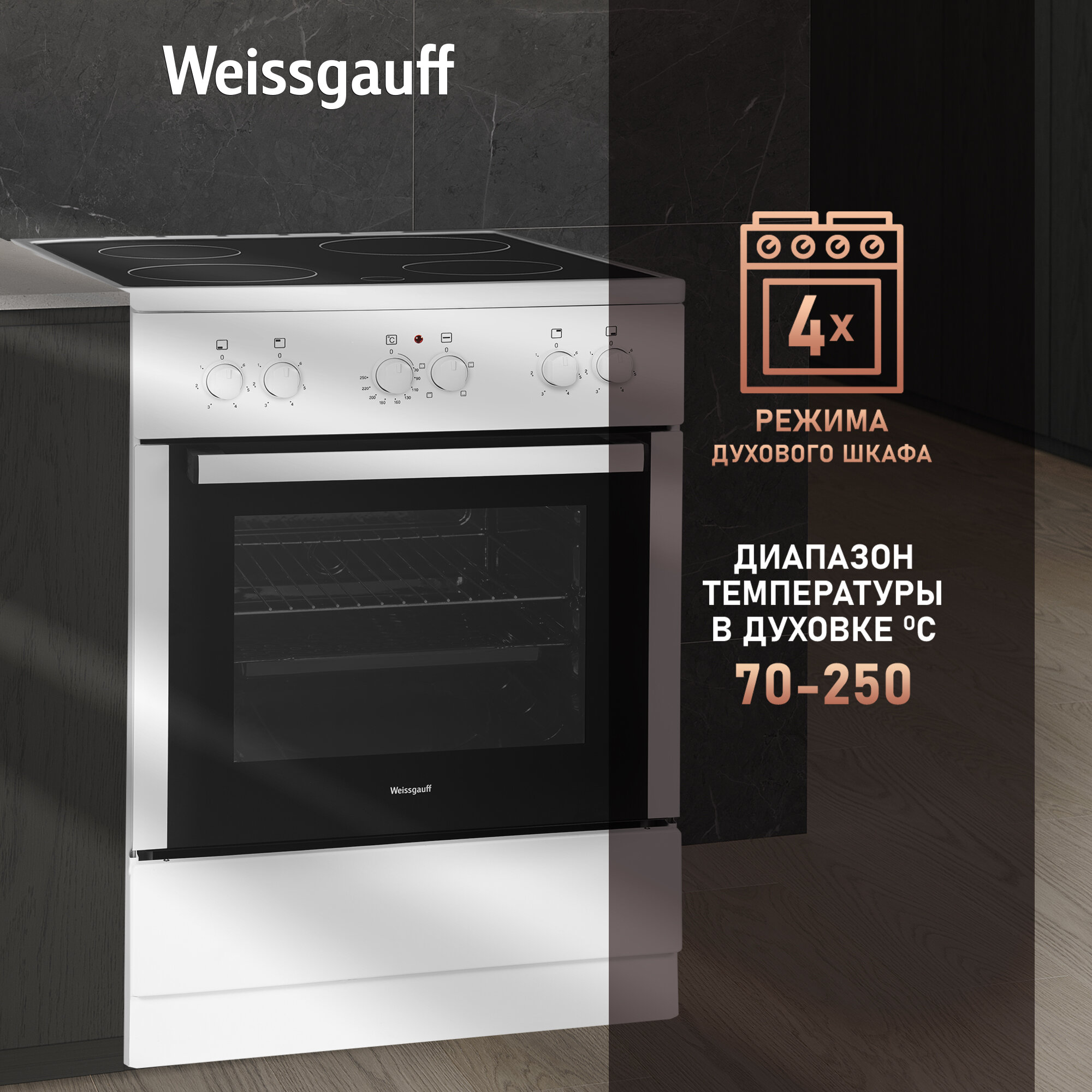 10 цен на Электрическая плита Weissgauff WES E1V07 W 3 года гарантии, Объем 50 литров, Технологичные поворотные переключатели Soft Switch, Термостат духового шкафа