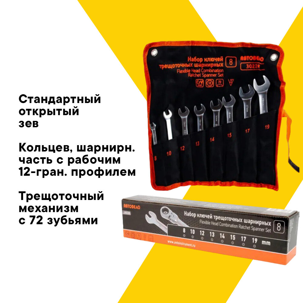 Набор ключей рожково-накидных 8 шт Автодело (трещоточные, шарнирные, 8 предметов, 8-19 мм) тетроновая сумка