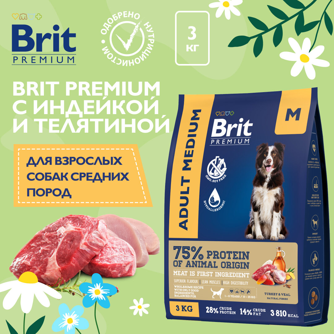 Корм сухой Brit Premium Dog Adult Medium для взрослых собак средних пород 10–25 кг, с индейкой и телятиной 3 кг 1 540 ₽