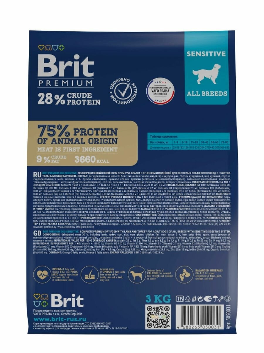BRIT PREMIUM Сухой корм с ягнёнком и индейкой для собак всех пород "Dog Sensitive", 3 кг 2 329 ₽