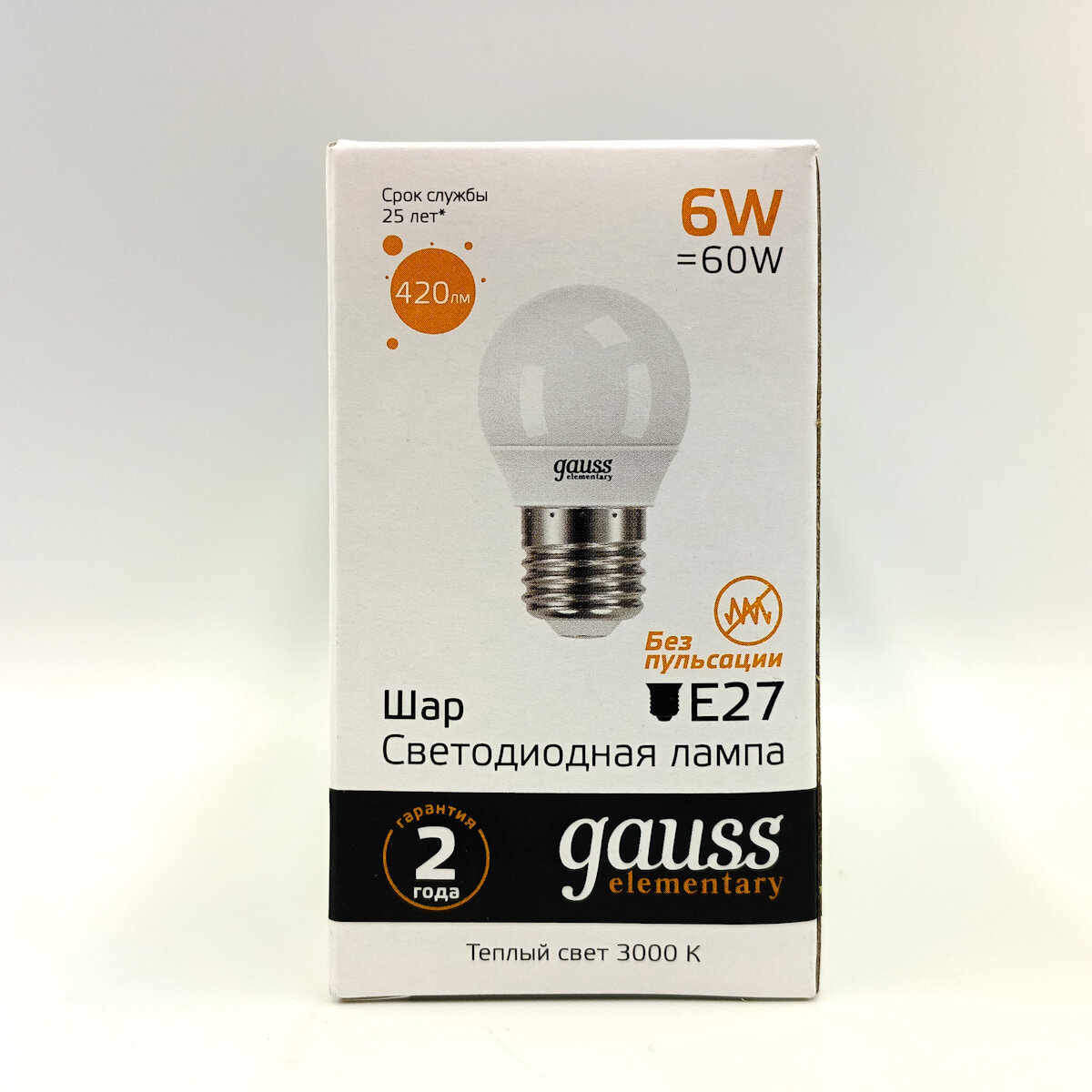 10 цен на (5 шт.) Светодиодная лампочка Gauss G45 шар, мощность 6 Вт, напряжение питания 180-240 В, цветовая температура 3000 К, теплый белый свет, цоколь E27, размер 45х78 мм, 53216