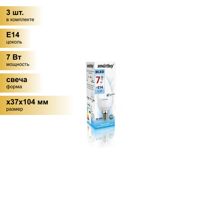 (3 шт.) Светодиодная лампочка Smartbuy свеча C37 E14 7W(550lm) 4000K 4K матовая пластик SBL-C37-07-40K-E14 . Цоколь E14 информация: