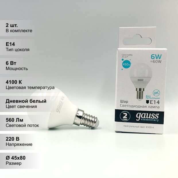 (2 шт.) Светодиодная лампочка Gauss G45 шар, мощность 6 Вт, напряжение питания 180-240 В, цветовая температура 4100 K, нейтральный белый свет, цоколь E14, размер 45х80 мм, 53126 информация: