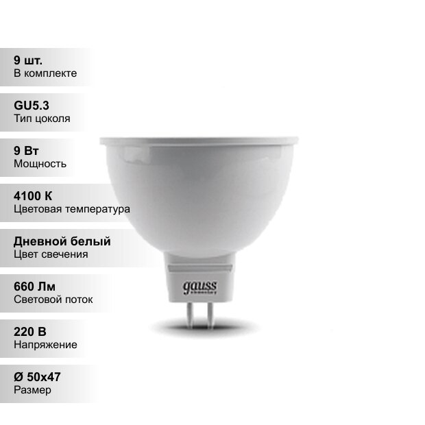 (9 шт.) Светодиодная лампочка Gauss MR16 9Вт 220В 4100K GU5.3 информация: