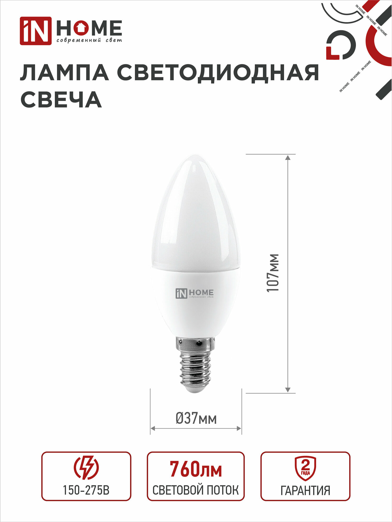 Отзывы на IN HOME Лампа светодиодная LED-СВЕЧА-VC 4PACK 8Вт 230В Е14 4000К 760Лм (4шт./упак) (арт. 4690612047782) 1шт.