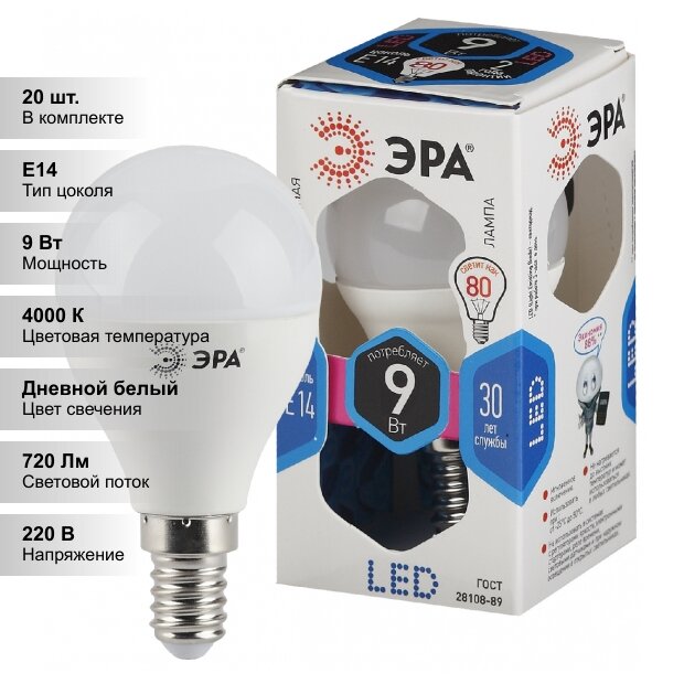 (20 шт.) Светодиодная лампочка ЭРА P45 9Вт 170-265В 4000К Е14 информация: