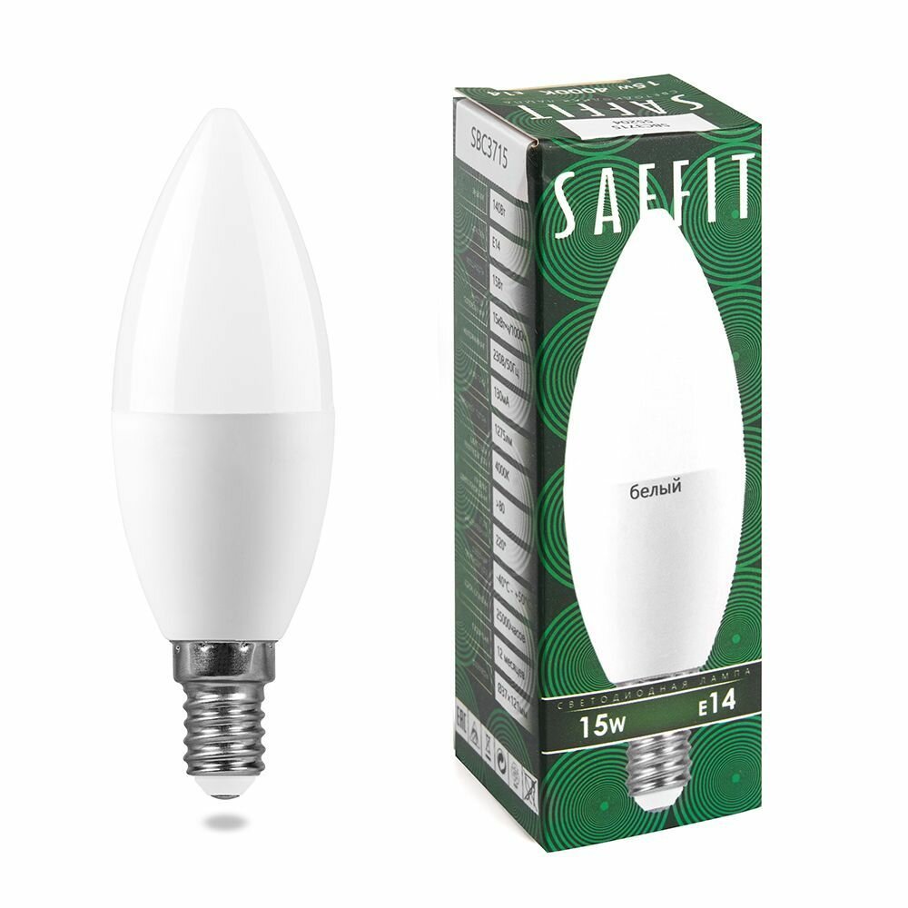 (15 шт.) Светодиодная лампочка Saffit свеча С37 Е14 15W(1275Lm) 4000K 4K матовая 121x37 SBC3715 55204 Нейтральный белый. Цоколь E14 3 259 ₽