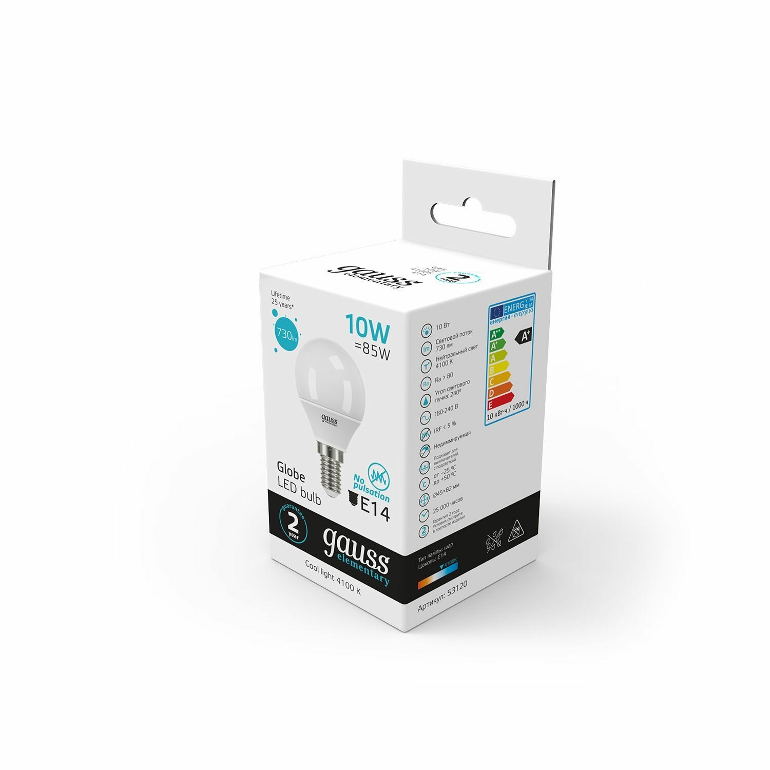 (20 шт.) Светодиодная лампочка Gauss Elementary Шар G45 E14 10W(730lm) 4100K 4K 86x45 матовая, пластик/алюм. 53120 Нейтральный белый. Цоколь E14 5 319 ₽