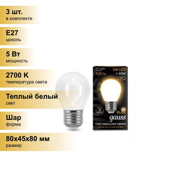 (3 шт.) Светодиодная лампочка Gauss Filament Шар G45 E27 5W(420lm) 2700K 2K матов. 80x45 филамент (нитевидная), 105202105 Теплый белый. Цоколь E27 информация: