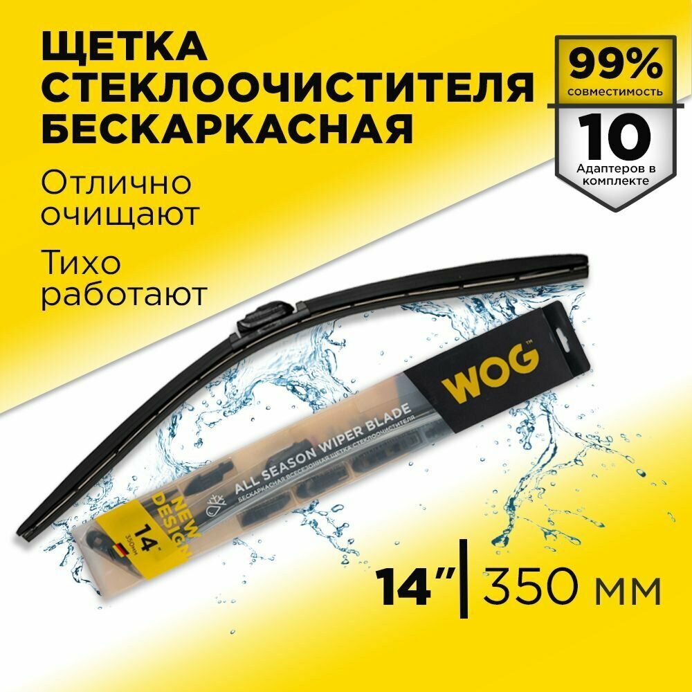 Щетка стеклоочистителя, дворники автомобильные бескаркасные 14" (350 мм) с комплектом адаптеров 10 шт WOG WGC1401, 1 шт