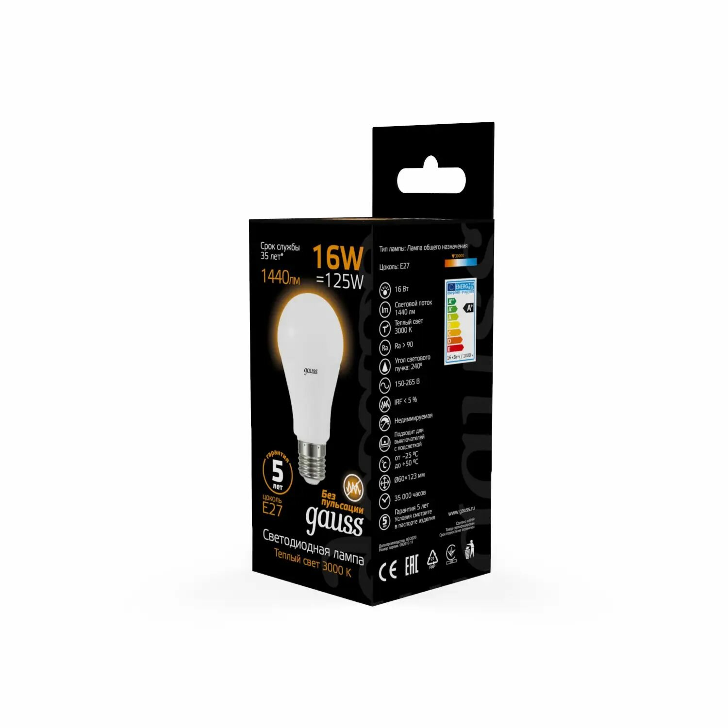 (5 шт)Лампа Gauss A60 16W 1440lm 3000K E27 LED информация: