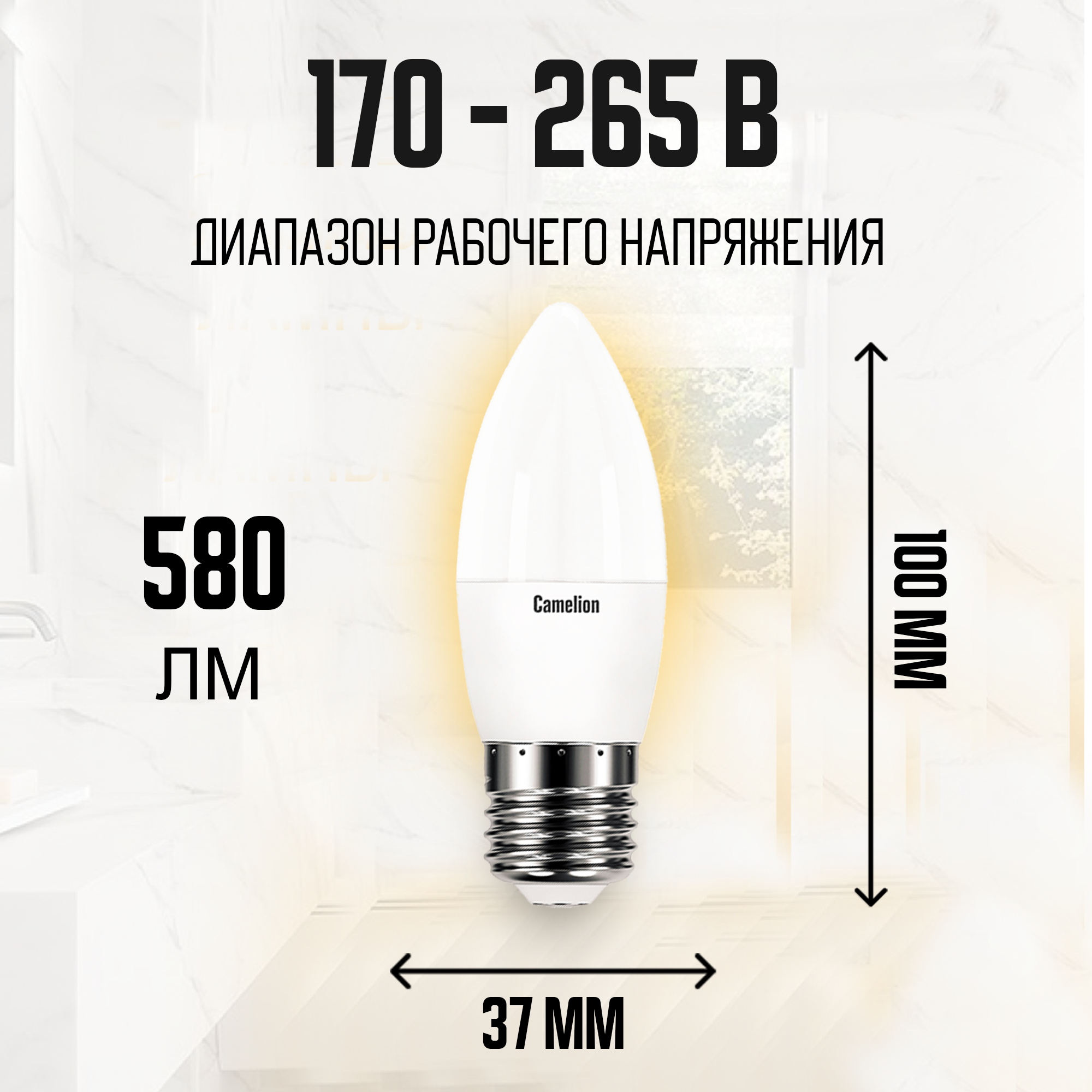 Лампа светодиодная E27, 7 Вт, 60 Вт, свеча, 3000 К, свет теплый белый, Camelion