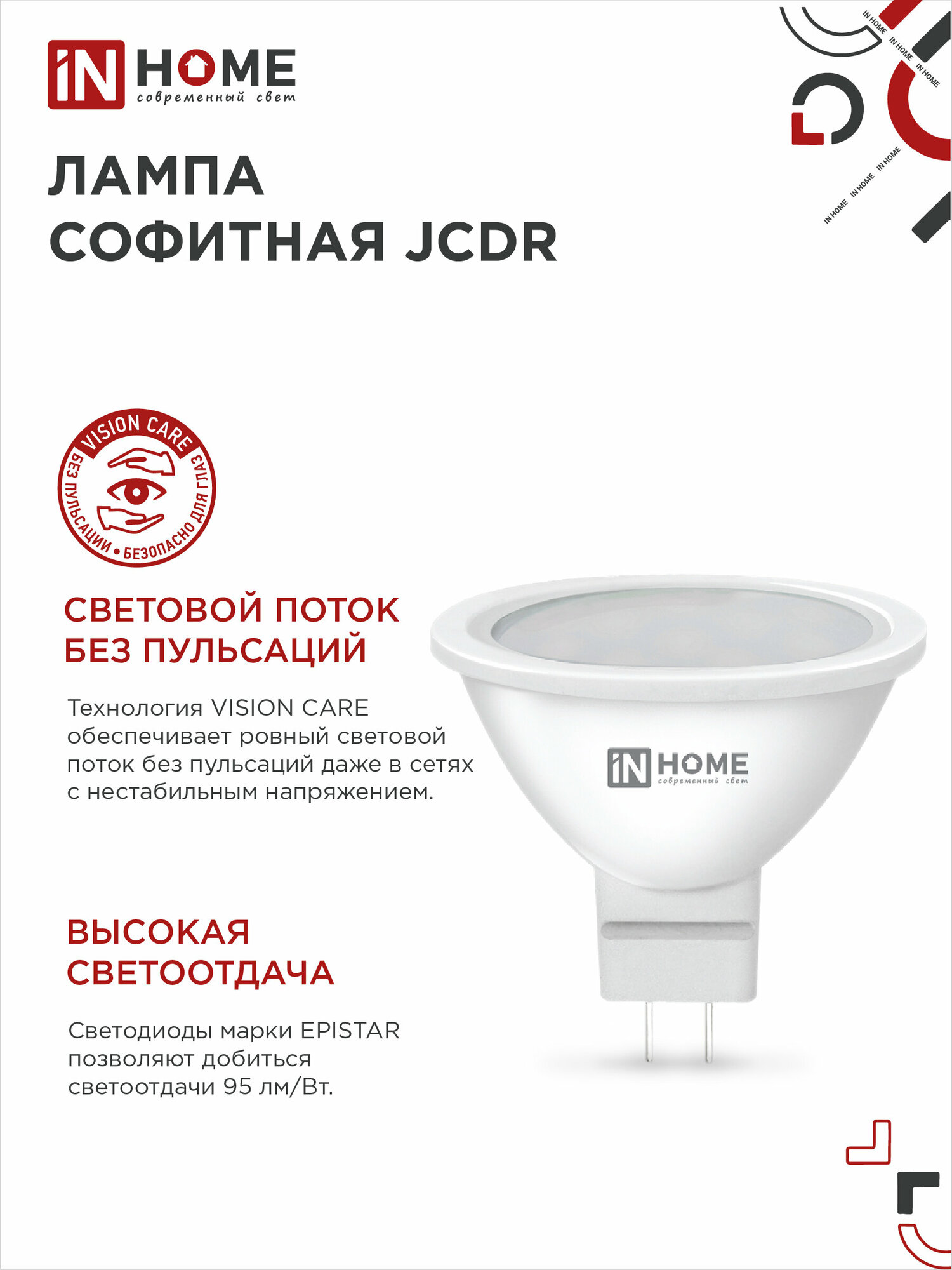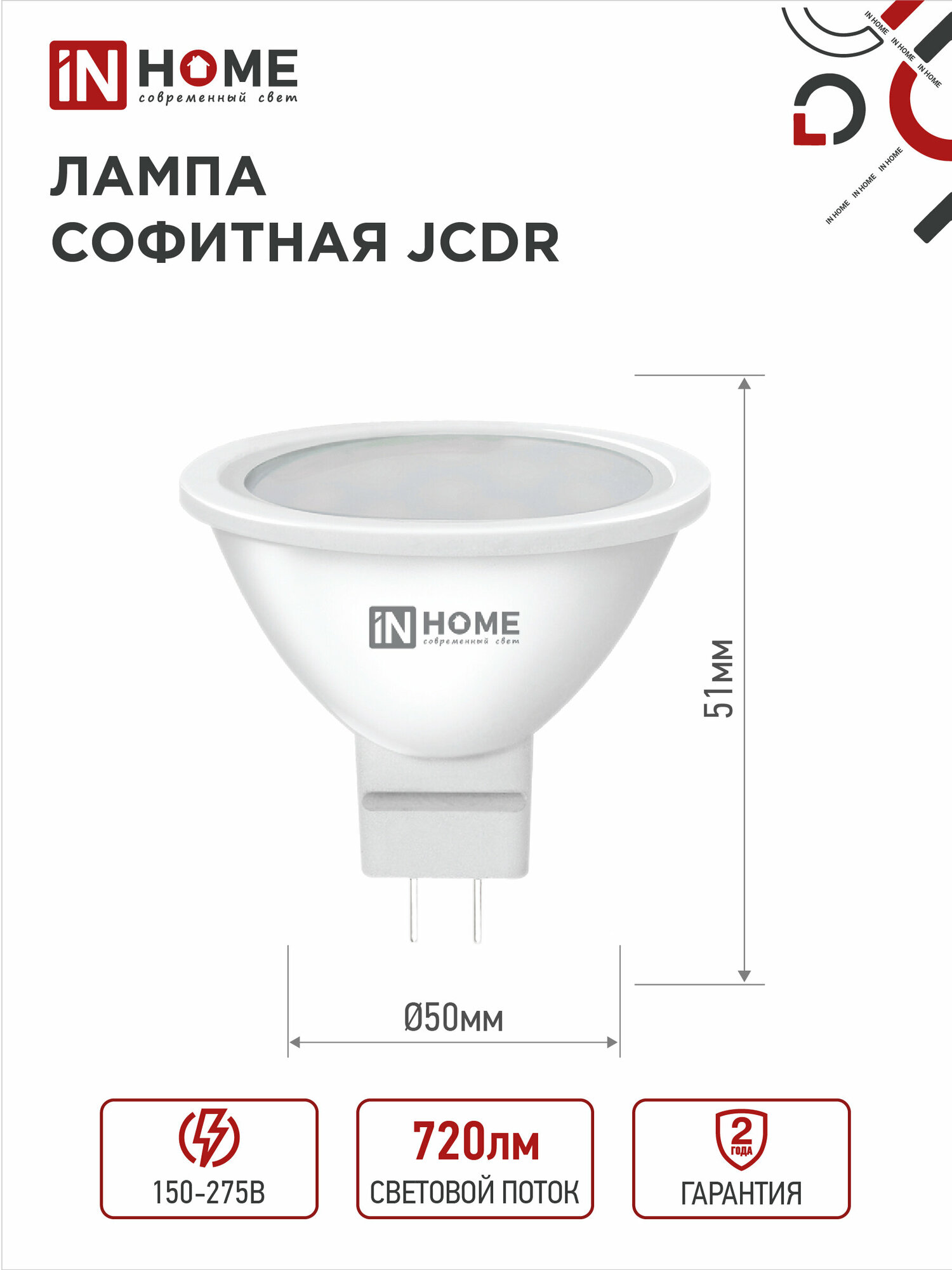 (9 шт.) Светодиодная лампочка IN HOME JCDR, мощность 6 Вт, напряжение питания 220 В, цветовая температура 3000К, теплый белый свет, цоколь GU5.3, размер 50х51 мм 759 ₽