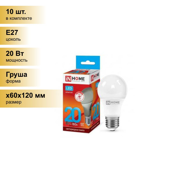 Упаковка светодиодных ламп 10 шт. IN HOME LED-A60-VC (4690612020303), E27, A60, 20 Вт, 4000 К