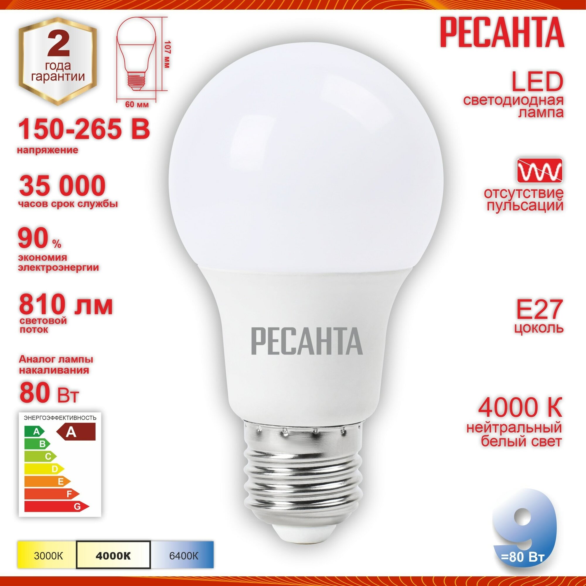 Лампа светодиодная РЕСАНТА 76/1/13, E27, A60, 9Вт, 3000 К
