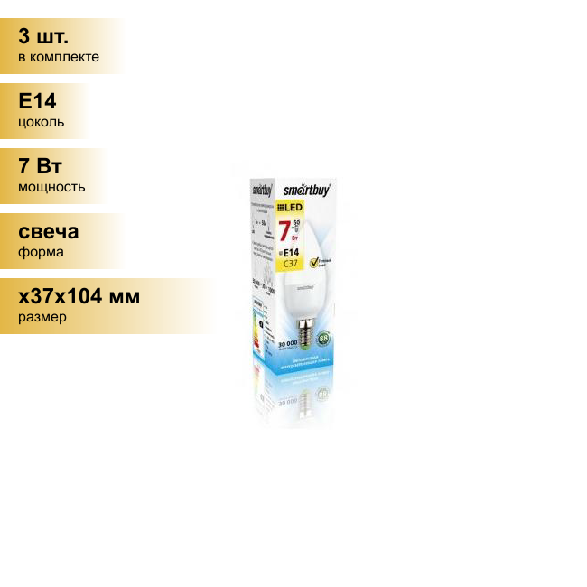 (3 шт.) Светодиодная лампочка Smartbuy свеча C37 E14 7W(500lm) 3000K 2K матовая пластик SBL-C37-07-30K-E14 . Цоколь E14 информация: