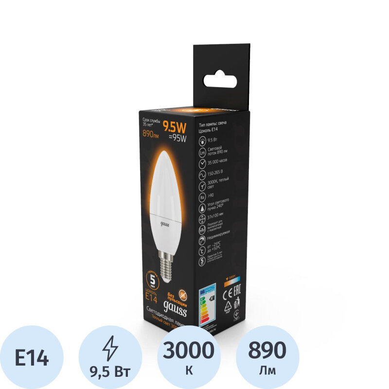 Светодиодные лампы GAUSS Лампа светодиодная Black 9.5Вт свеча 3000К тепл. бел. E14 890лм GAUSS 103101110 (упаковка 5 шт)