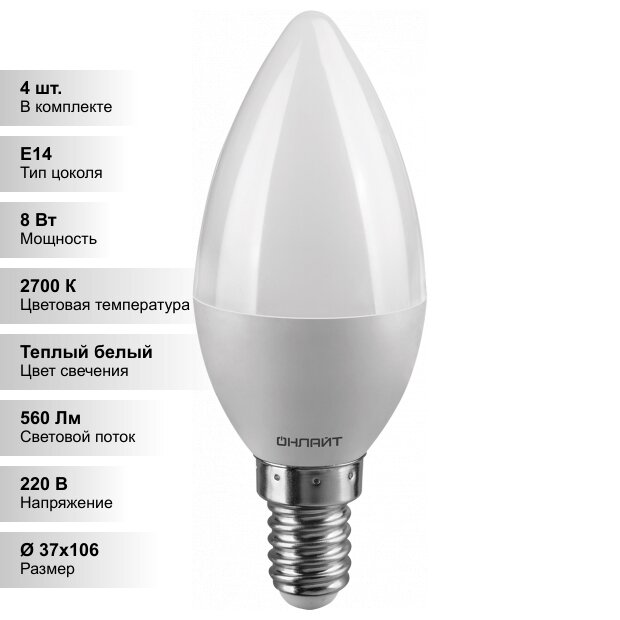(4 шт.) Светодиодная лампочка онлайт C37 8Вт 230В 2700K E14 информация: