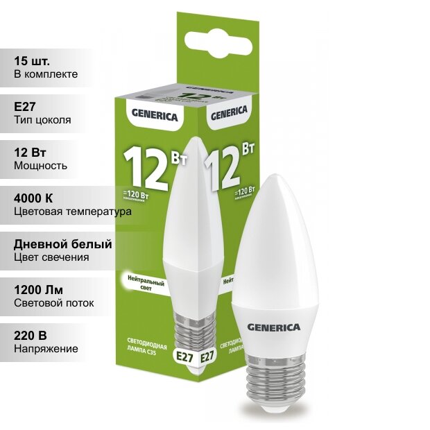 (15 шт.) Лампа LED C35 свеча 12Вт 230В 4000К E27 GENERICA информация: