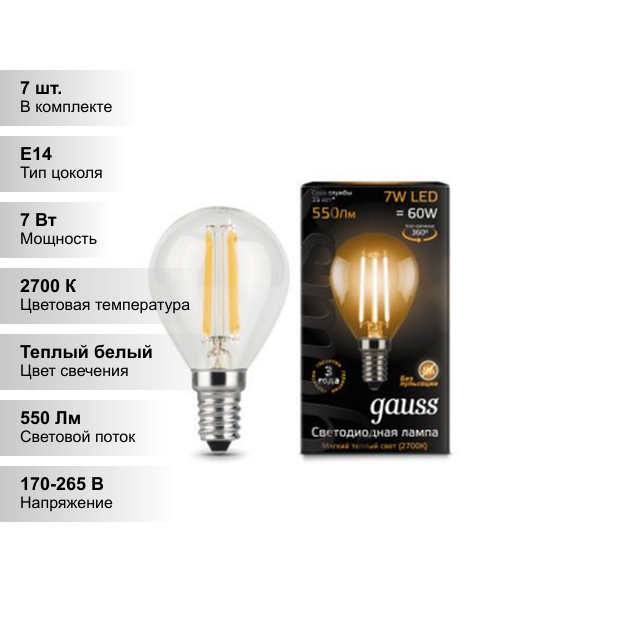(7 шт.) Светодиодная лампочка Gauss Globe G45 7Вт 150-265В 2700K E14 филамент. информация: