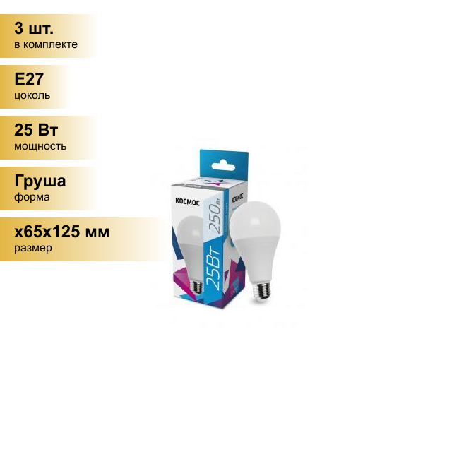 (3 шт.) Светодиодная лампочка Космос ЛОН A65 E27 25W (2100lm) 4500K 4K матов. 134x65 LkecLED25wA65E2745 . Цоколь E27 информация: