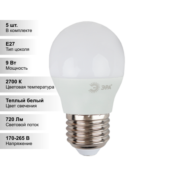 (5 шт.) Светодиодная лампочка ЭРА P45 9Вт 170-265В 2700К E27 информация: