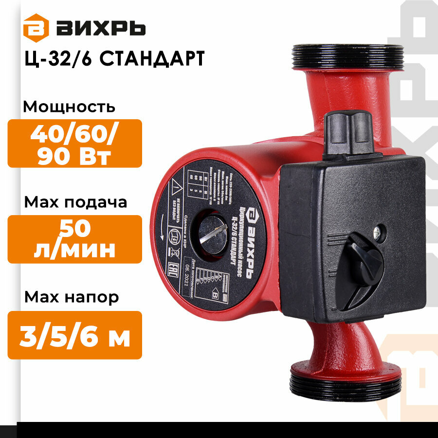 Насос / Циркуляционный насос Вихрь Ц-32/6 стандарт (90 Вт, 50 л/мин, напор - 6 м, 3 режима) информация: