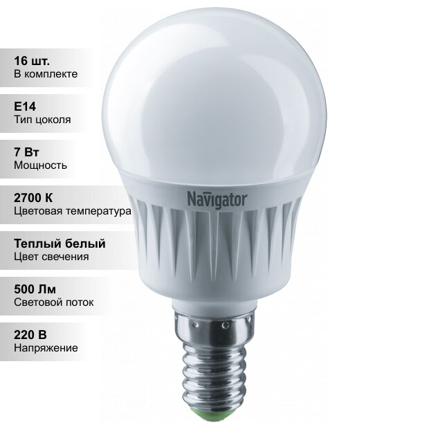 (16 шт.) Светодиодная лампочка Navigator G45 7Вт 230В 2700K E14 информация:
