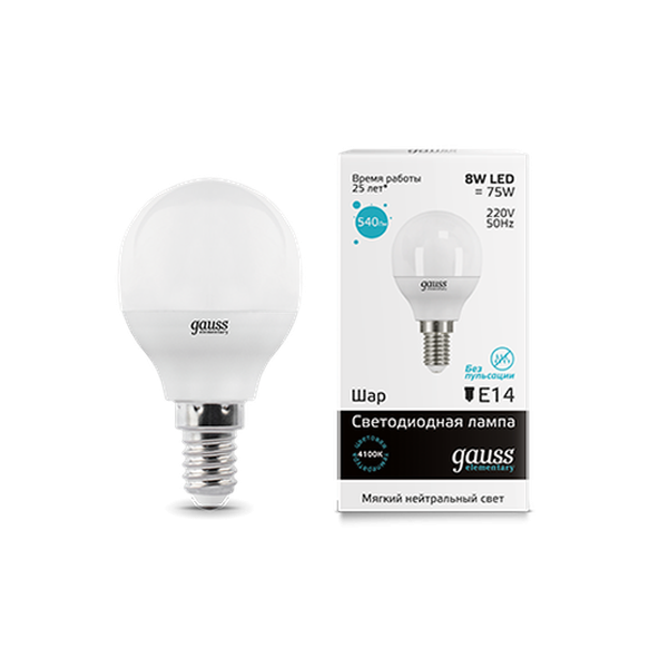 Gauss Elementary Шар G45 E14 8W(540lm) 4100K 4K 82x45 матовая, пластик/алюм. 53128 (арт. 613262)
