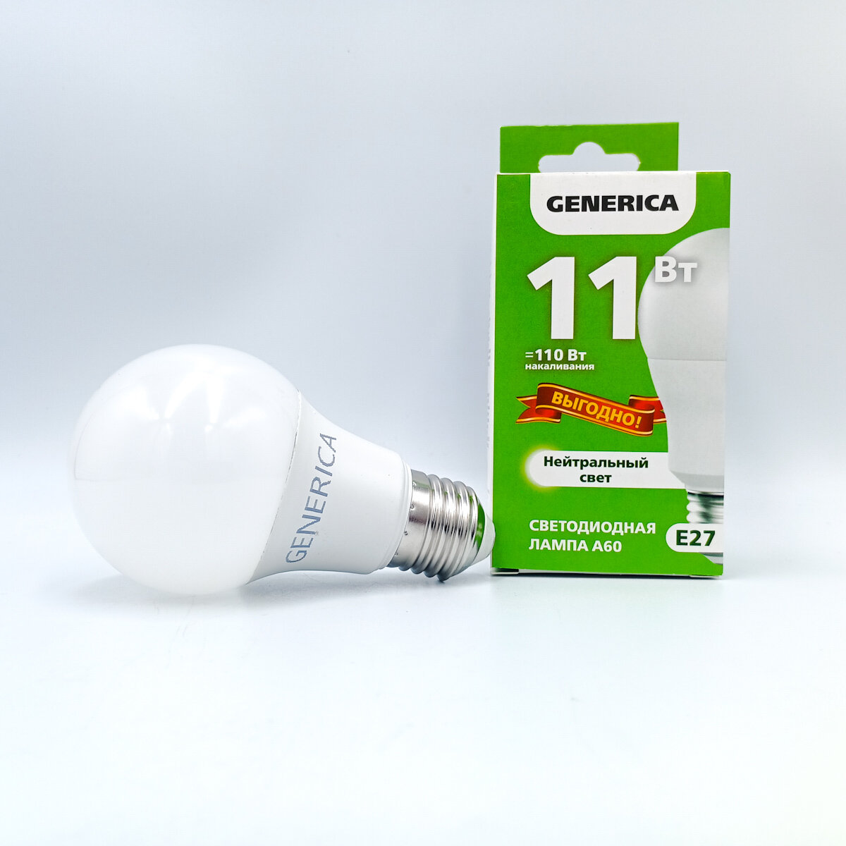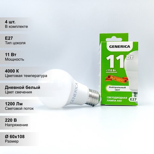 Отзывы на (4 шт.) Светодиодная лампочка GENERICA A60 груша, мощность 11 Вт, напряжение питания 220 В, цоколь Е27, цветовая температура 4000 К, нейтральный белый свет, световой поток 1200 Лм, размер 60х108 мм