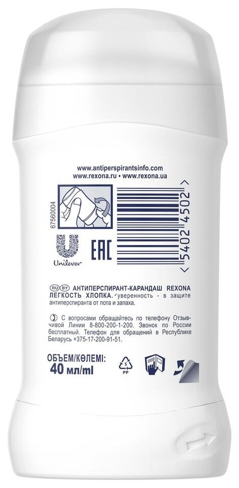 Отзывы на Rexona антиперспирант-дезодорант-карандаш Легкость хлопка 40 мл