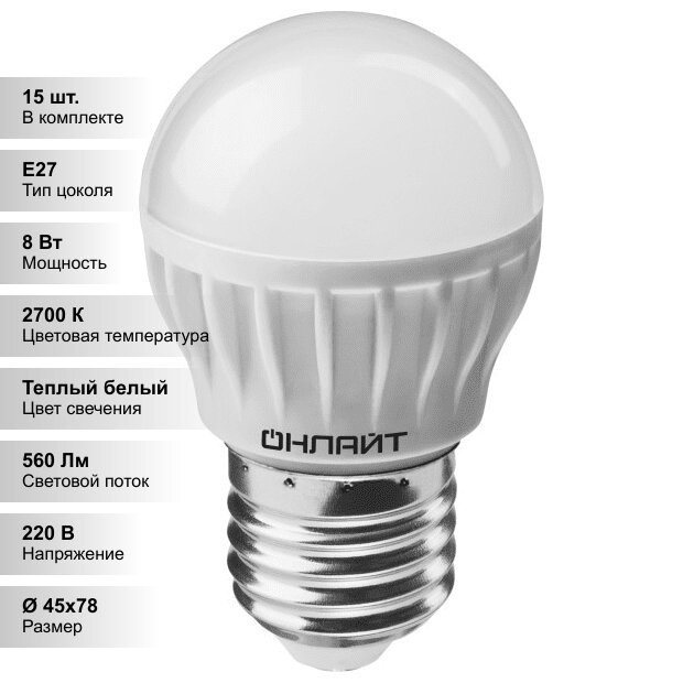 (15 шт.) Светодиодная лампочка онлайт G45 8Вт 230В 2700K E27 информация: