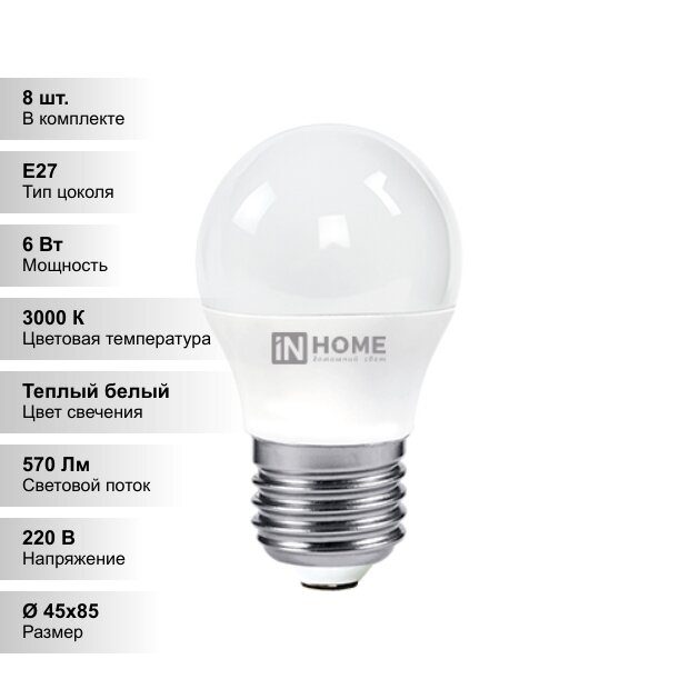 (8 шт.) Светодиодная лампочка IN HOME P45 6Вт 230В 3000К Е27 информация: