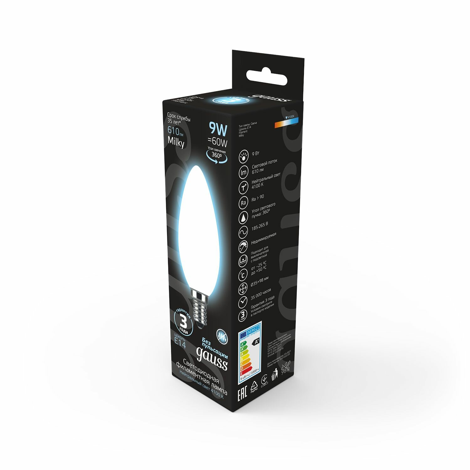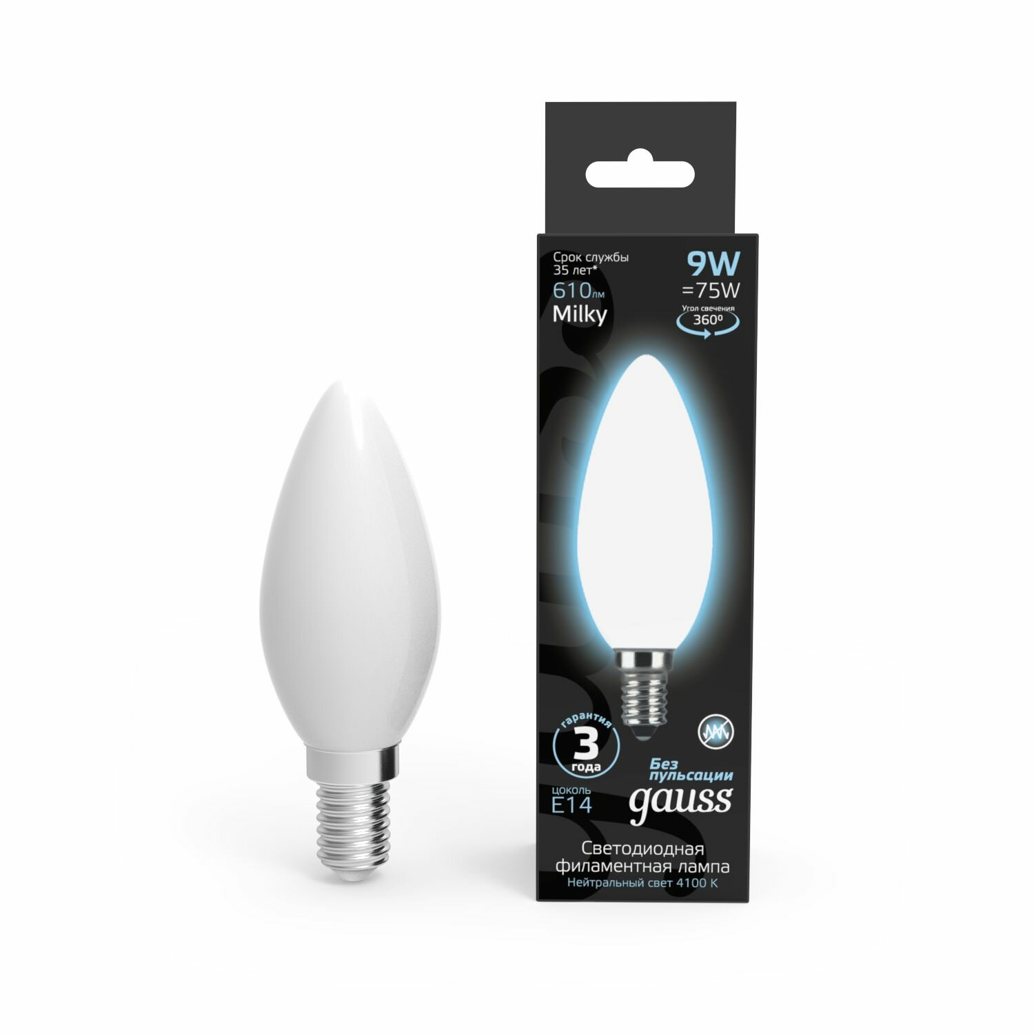 Отзывы на Лампа светодиодная Е14 Свеча 9W нейтральный белый свет 4100К упаковка 10 шт. Gauss Filament