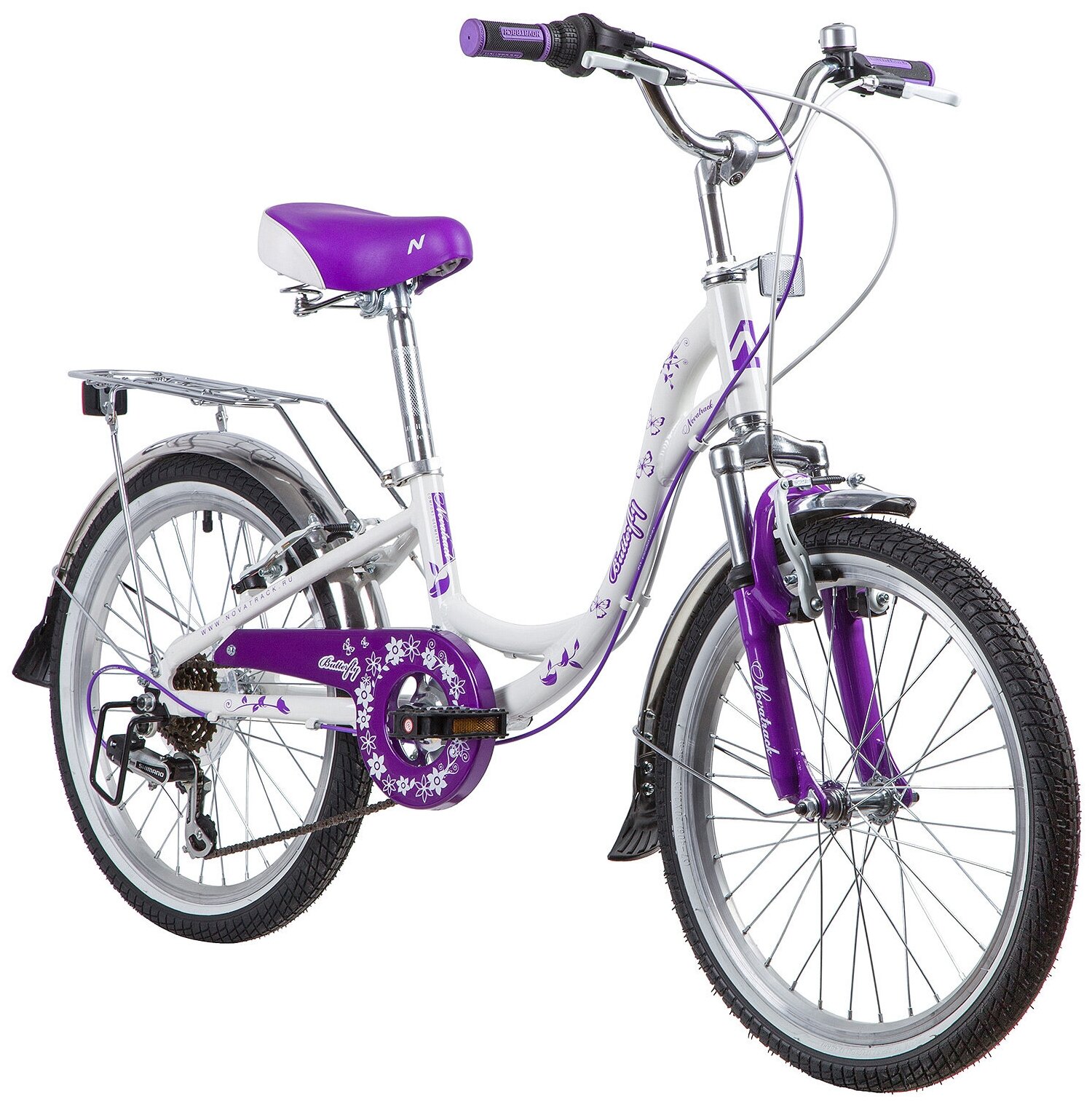 Велосипед NOVATRACK 20", BUTTERFLY 2019 , белый-фиолет., сталь, 6-скор, TY21/RS35/SG-6SI, V-brake