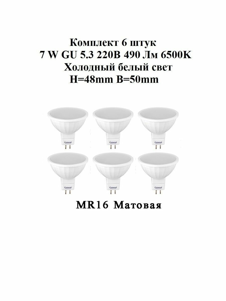 Лампочка светодиодная, General, Комплект из 6 шт., 7 Вт, Цоколь GU5.3, 6500К, Форма лампы Круг, MR16 информация: