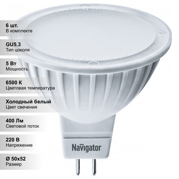 (6 шт.) Светодиодная лампочка Navigator MR16 5Вт 230В 6500K GU5.3 информация: